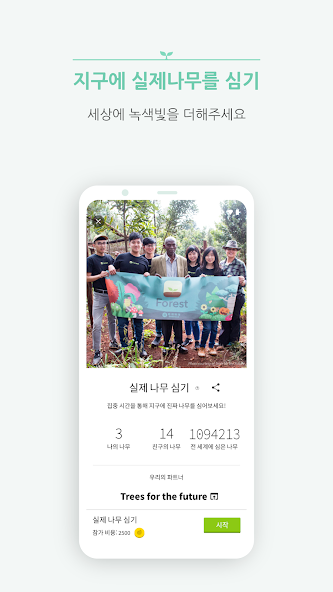 사용자가 앱을 통해 일정 목표를 달성하면 실제로 나무 심기 프로젝트에 기여할 수 있습니다.