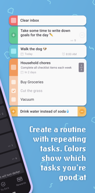 할 일을 완료하면 경험치를 얻고, 미션을 달성하면 캐릭터가 성장하는 등 RPG 게임과 유사한 시스템을 갖추고 있어 재미있게 습관을 형성할 수 있습니다.