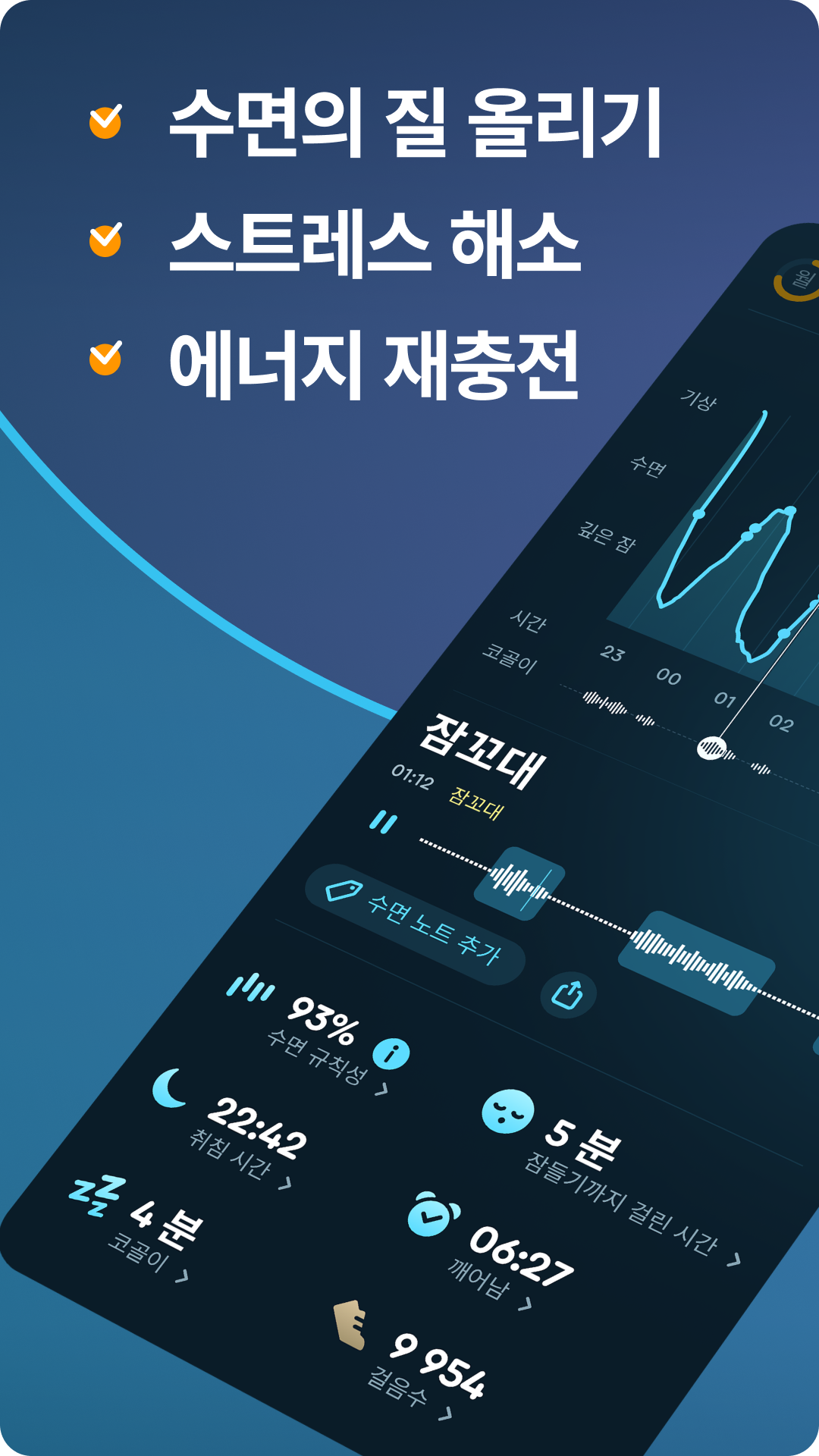 - 기상 후 확인: 수면 품질, 코골이 기록, 수면 시간 등을 확인할 수 있습니다.